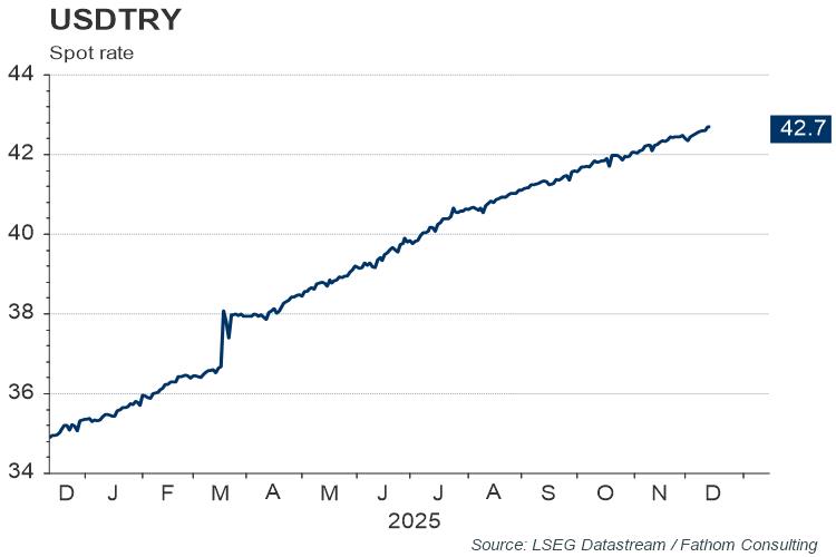 Without substantial reserves, the central bank is left with interest rates as its primary tool to defend the currency’s value. Higher short-term interest rates would help to keep domestic savers from transferring money abroad and could attract inflows from outside the country as well. However, for some time, the country has pursued an unorthodox monetary policy approach that has seen interest rates decline even against rapidly rising inflation. This is in contrast to the textbook approach to monetary policy, where higher inflation prompts central bankers to set higher interest rates in order to contain and then suppress price pressures.