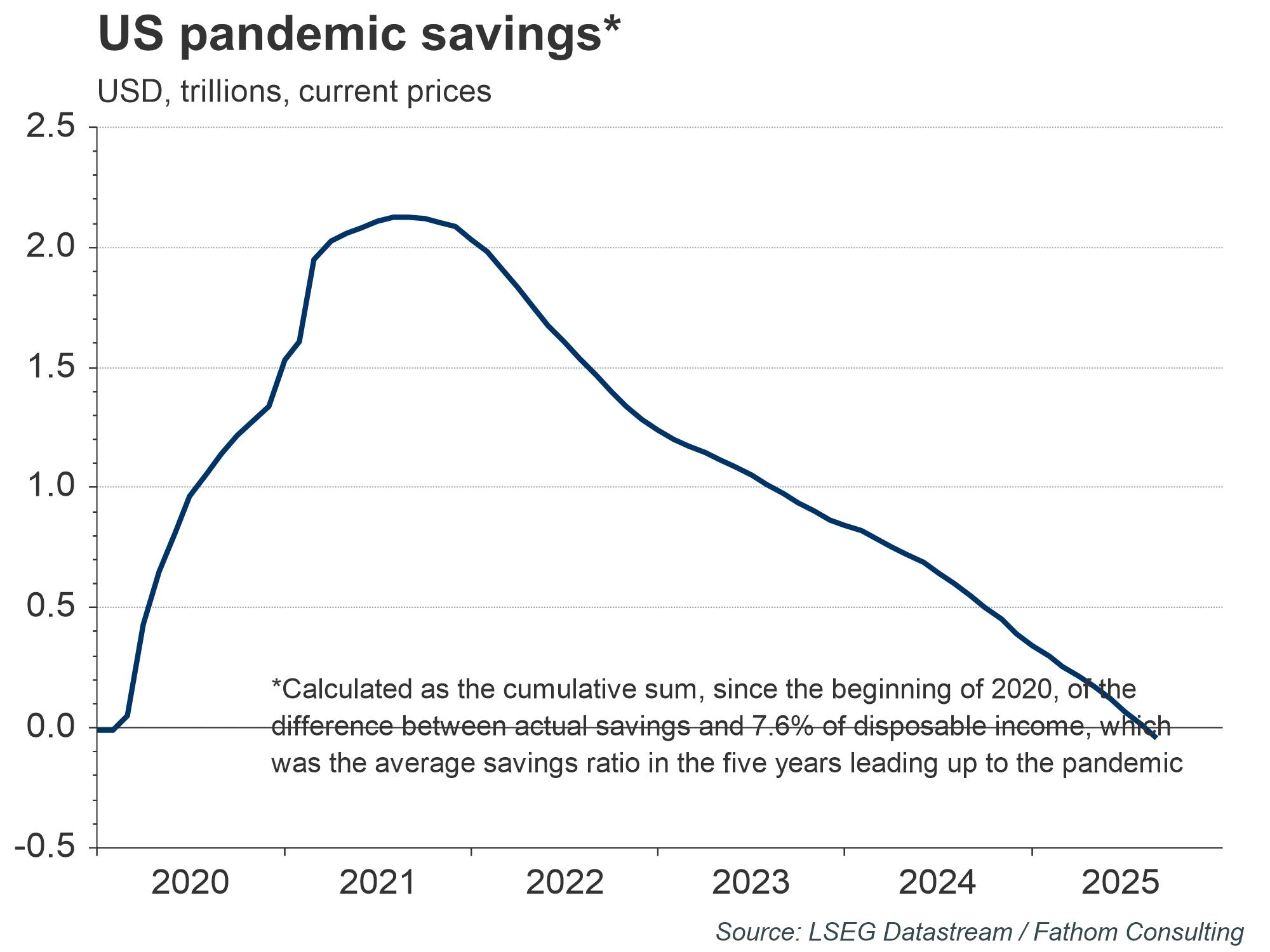 A key reason why the US has been more resilient to the current hiking cycle than economists expected is the large amounts of excess savings held by households – we estimate these to be over US$1.5 trillion as of April this year. Excess savings rose significantly during the pandemic due to the substantial fiscal transfers from the government and have only partially been spent since the US reopened. US households have thus been able to absorb the higher living costs without reducing their spending as much as they would otherwise have been forced to do.