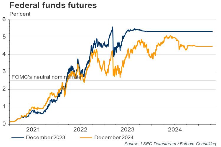 The FOMC increased its benchmark interest rate by 25 basis points after its July meeting, as had been widely anticipated. There was no surprise, either, in the accompanying statement, which differed little from June’s. However, there was a change of tone in the press conference that followed. In response to a question, Jay Powell said that the Fed staff are no longer forecasting a recession. Market participants have increasingly priced in this type of ‘soft landing’ scenario. Despite still-high inflation, risk assets have done very well this year alongside expectations for relatively steep interest rate cuts next year. Such an outcome is certainly plausible. But it has become increasingly priced in by investors and policymakers, leaving the door open for disappointment.