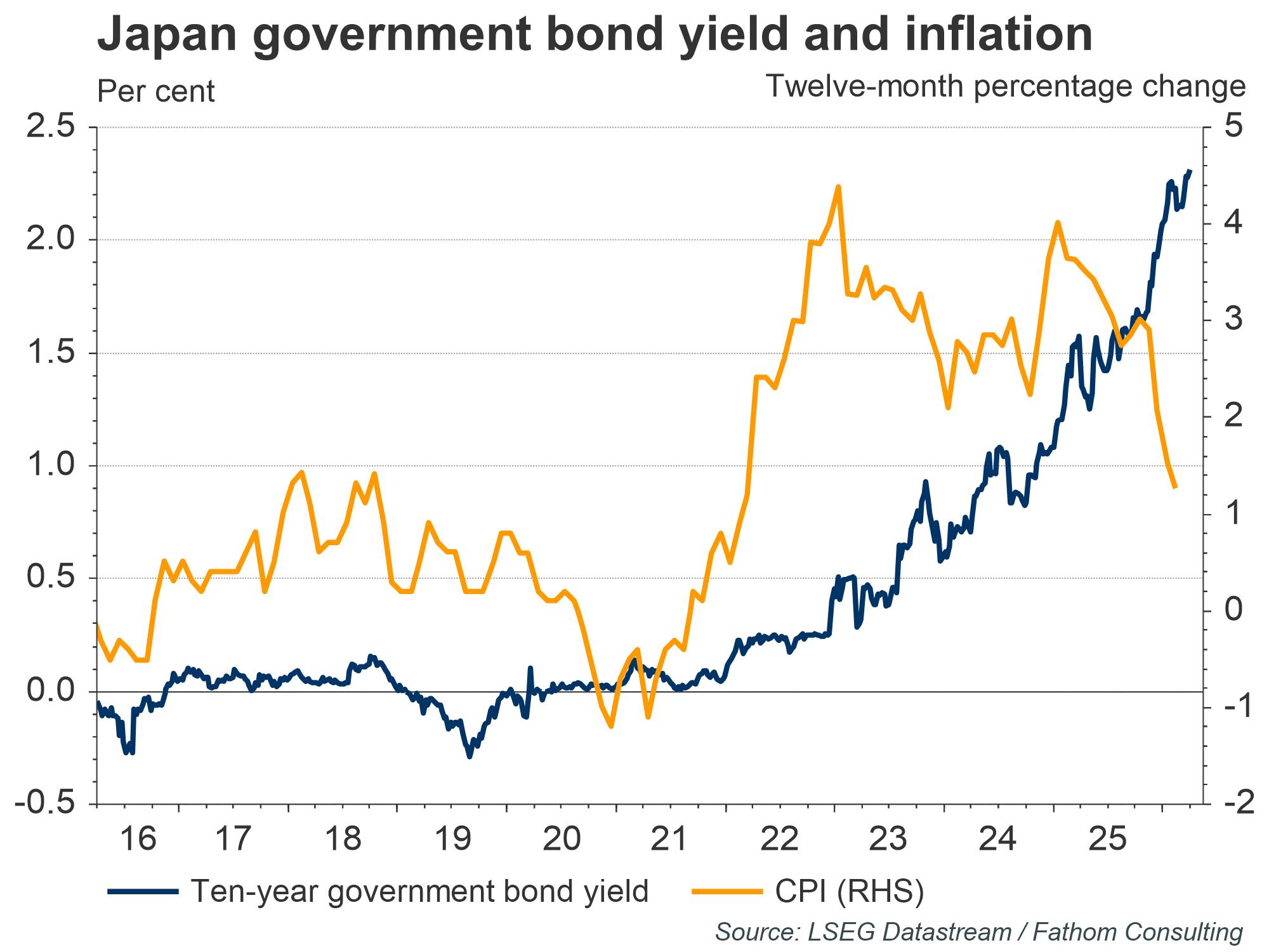 Yields on Japanese ten-year government bonds have reached their highest level in nine years, currently at 0.641% as of 7 August, up from 0.438% ten days earlier. The surge began on 28 July when the Bank of Japan (BoJ) unexpectedly altered its strict yield curve control (YCC) policy. The harsh 0.5% upper limit on bond yields that the Bank had previously enforced will now instead be viewed as a “reference”, and the BoJ will be buying ten-year Japanese government bonds at 1%. The BoJ has faced increased pressure this year to reduce its ultra-loose monetary policy stance, as inflation reached 3.87% in January — highs not seen in Japan since the early 1980s — and as the Japanese yen has been losing value quickly due to the widened yield gap between Japan and many other advanced economies. The BoJ has stated however that it is not changing its negative policy rate: a reluctance deep-rooted in Japan’s deflationary history. Moreover, the BoJ seems persuaded that the current bout of inflation is driven more by higher import prices than strong demand, and indeed seems implicitly to place a lot of faith in inflation being a temporary phenomenon. Higher import prices are increasingly less driven by global supply constraints and increasingly more by a weaker yen. The partial easing of the YCC policy is likely to alleviate some of the pressure on the yen; but not by much, as foreign monetary policy decisions, particularly in the US, will continue to be an important driver of import prices and inflation. Fathom expects the Fed to be close to a peak in its monetary policy cycle. Significant risks remain, however — risks that the BoJ continues to be reactive towards, a risky game indeed.