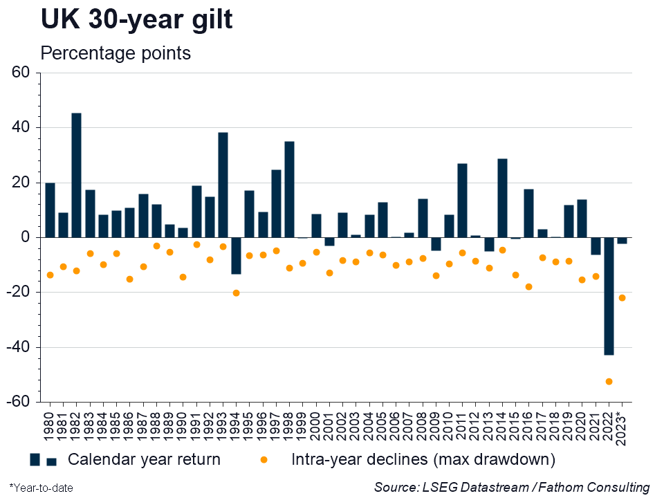 Fathom believes that the UK’s recovery is likely to be derailed. The rate rises already in place may well mean that recession is now ‘out for delivery’ (Fathom’s first risk scenario); and there is an additional risk that ‘sticky inflation’ (Fathom’s second risk scenario) may require material further tightening. These risks are reflected in the pricing of the UK 30-year gilt, which has not only failed to bounce back after experiencing its worst performance in four decades in the wake of last year’s disastrous mini budget, but has also managed to produce negative returns and large drawdowns on a scale last witnessed during the 1994 bond crisis.