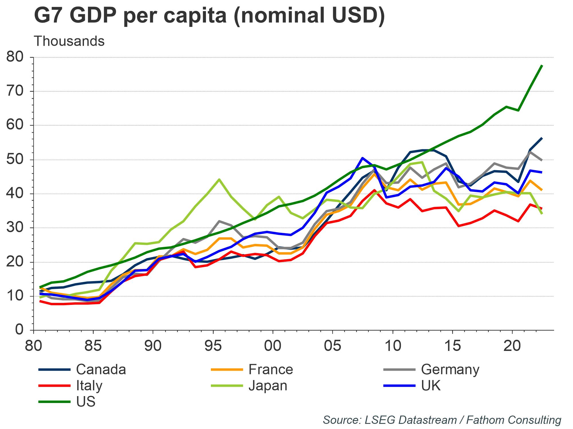 The US economy looks strong across multiple dimensions. US GDP has topped the global country rankings for more than 100 years, when measured at market exchange rates. Meanwhile, as the chart below shows, GDP per capita has been pulling away from the rest of the G7, with that gap widening notably over the past fifteen years. The US also comes first if GDP is adjusted to reflect the number of employees, rather than people.
