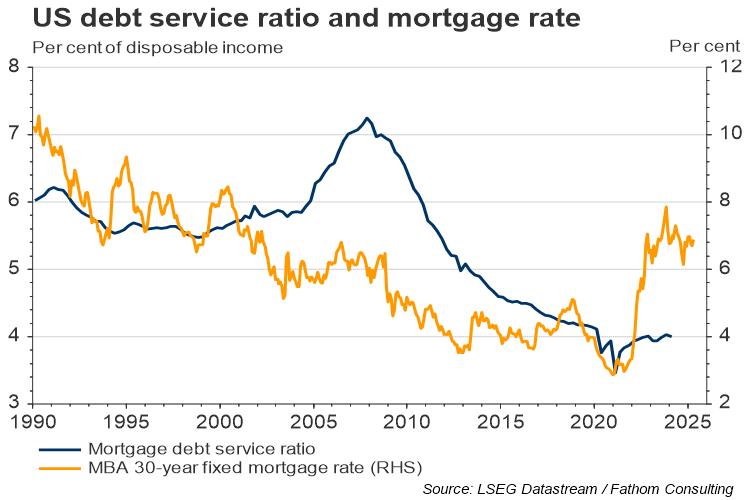 US mortgage rates recently climbed to their highest level in twenty years, yet house prices continue to rise. Mortgage delinquency rates are close to an all-time low, construction activity has held up well and the mortgage debt service ratio is low by historical standards. What is going on and how is the US housing market showing such resilience in the face of higher rates?