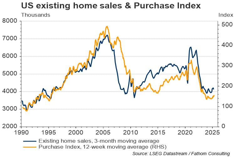 A key reason that prices haven’t fallen is down to a lack of movement in the market; homeowners, having locked in lower mortgage rates over the past few years, are currently reluctant to move, which would force them to switch onto a higher rate mortgage. The fact that many homeowners have locked in low rates also helps explain the low debt service ratio (although that may be attributed to higher salaries and lower mortgage debt, as a share of GDP). The lack of any movement is reflected in the chart below, which shows that sales of existing homes and the Mortgage Bankers’ Association’s Purchase Index are close to or at 25-year lows.