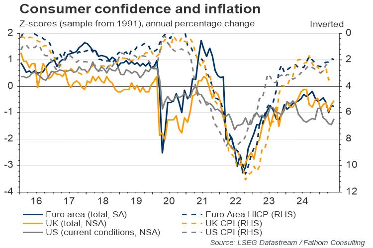 Falling inflation has lifted consumer confidence in the UK, US and EU, providing a boost to political incumbents ahead of upcoming elections. UK consumer confidence rose across all categories in January, according to GfK, a market research company, a fact which is likely to be welcome news for Rishi Sunak, the prime minister. However, it may take more than improved consumer confidence to turn around the 14 per cent approval rating of the current UK government, which must call an election within a year. In the US sentiment rose sharply in both December and January, reaching its highest level since July 2021, supported by confidence in both the inflation outlook and income expectations. While welcome news for Joe Biden, some recent opinion polls suggest that Donald Trump would win in November’s presidential election, assuming the two face off. Preliminary figures for European consumer sentiment showed a deterioration from December to January, however, countering the broad-based end of year improvement and keeping confidence well below its long-term average. This is in line with Fathom’s expectation for a consumer-driven recession in the euro area in the coming year.