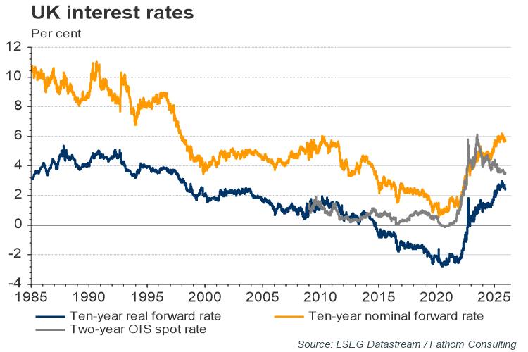 Long-term interest rates, both real and nominal, have risen dramatically across the major economies since late 2021. In the case of the UK, around half of the decline in long-term interest rates that had taken place over the past two to three decades has unwound in the space of two years. Does this mean we have entered a new paradigm? Have we moved from a world of ‘lower for longer’ to one of ‘higher for longer’, where to paraphrase Bank of England Chief Economist Huw Pill, the policy rate of interest will trace out a path that looks more like Table Mountain than the Matterhorn? We are far from convinced. As we show in our chart, in terms of timing, the increase in long-term interest rates has closely coincided with the increase in short-term interest rates, as measured by the two-year OIS spot rate. Moreover, one can trace the point at which both short- and long-term rates turned a corner, not just in the UK but in other major economies, back to late 2021 when US Federal Reserve Chair Jerome Powell decided that it was probably a good time to ditch the word ‘transitory’ as a description of the pick-up in inflation seen up to that point. In our view, the increase in long-term interest rates reflects a higher term premium, rather than a fundamental reassessment of the equilibrium real rate of interest. Uncertainty about the outlook for inflation, and for interest rates, means investors now require greater compensation to lend to governments, or indeed to anyone, in the long term. In Fathom’s central scenario, increased uncertainty fades over the coming year or two and long-term interest rates fall much further than is currently priced in.
