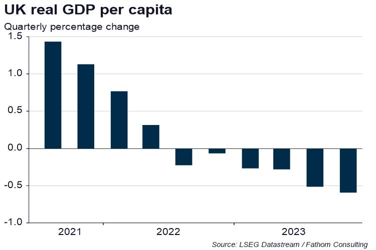In 2023 Q4 the UK economy contracted by 0.3% quarter-on-quarter, according to official figures. As this was the second consecutive quarterly contraction, the economy can be said to have entered a technical recession in the second half of last year, according to one definition. More alarming however is when the same figures are reviewed on a per capita basis – i.e. real GDP growth after stripping out increases in population, a metric that is often used as a proxy for living standards. On this measure, growth has been negative for seven consecutive quarters, the longest run of negative returns since records began in 1955; and the contraction on this basis has increased in each of the last four quarters. Some other G7 nations, such as Germany and Japan, are performing poorly too, but with a general election due to be called later this year, Rishi Sunak, the UK prime minister, will be hoping for a turnaround in the coming quarters.