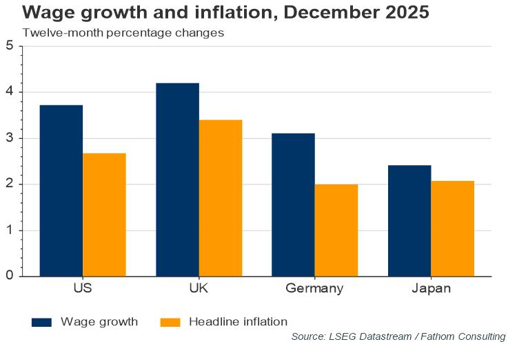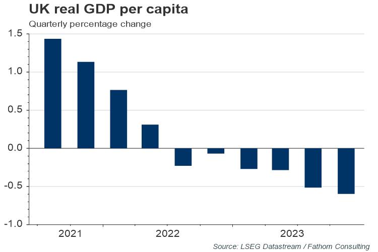 By contrast, the case for rate cuts in the UK appears stronger, even though inflation remains further above target than in the US. The inflation figure for January came in lower than expected last week, at 4.0%, while the Q4 GDP print showed that the economy contracted by 0.3% quarter-on-quarter. By some definitions, this means that the UK went into a technical recession in the second half of last year; more concerningly, it also means that real per capita GDP has now contracted in seven consecutive quarters. This weakness ought to increase the odds of rate cuts, although the Bank of England Governor, Andrew Bailey, has on several occasions expressed concern about wage growth, which, is now exceeding headline inflation, as it is in the US.