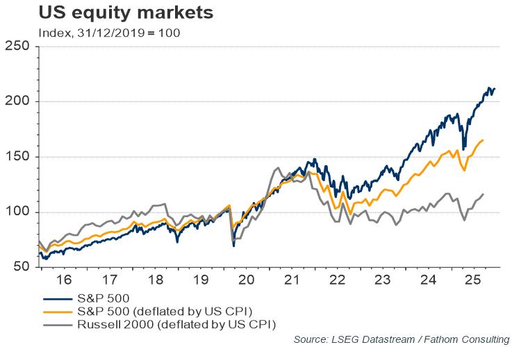 The S&P 500 rose to a record high this week, aided by strong performance by large tech-heavy multinationals. The benchmark US index has been aided by stellar performance among the ‘Magnificent Seven’,[1] as well as by a general increase in the price level. Once adjusting for inflation the S&P 500 is well above its end-2019 level, albeit still off its previous highs. However, the Russell 2000, which is made up of 2000 small-cap stocks, has floundered. Once the increase in the price level is accounted for, that index remains stuck at 2019 levels.