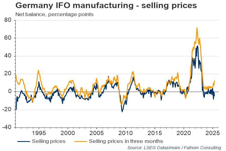 Next, this weakness in manufacturing means that there is capacity in the system to absorb delays. Admittedly, the delays to goods have affected some large companies relatively more, with Tesla announcing a shutdown in January related to Red Sea disruptions. However, survey data suggest that the shock has been absorbed without huge disruption to production lines. Current selling prices for manufactured goods and the prices expected in three months’ time remain within normal ranges, according to the ifo Institute in Germany (Leibniz Institute for Economic Research, at the University of Munich).