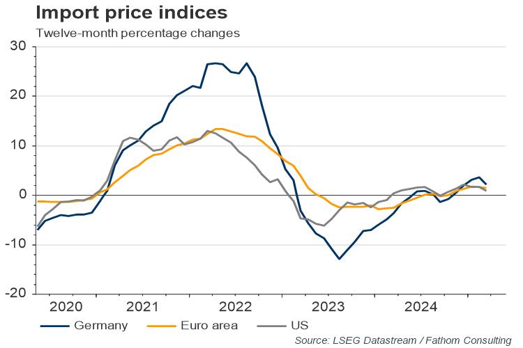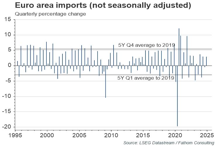 The first piece of luck is the timing of the disruption. Imports are seasonal, with Europe importing more in Q4 than in Q1, due to the festive season. Disruptions in the Red Sea really escalated at the end of 2023 and so did not have a material impact during the busiest quarter. In the five years to 2019 (pre-COVID), quarterly import growth for the euro area was 5.4%. The quarterly figure tends to drop by 2.2% in Q1. The disruptions so far this year have come at a good time. Of course, this benefit will not be sustained if disruptions remain in place throughout the year.