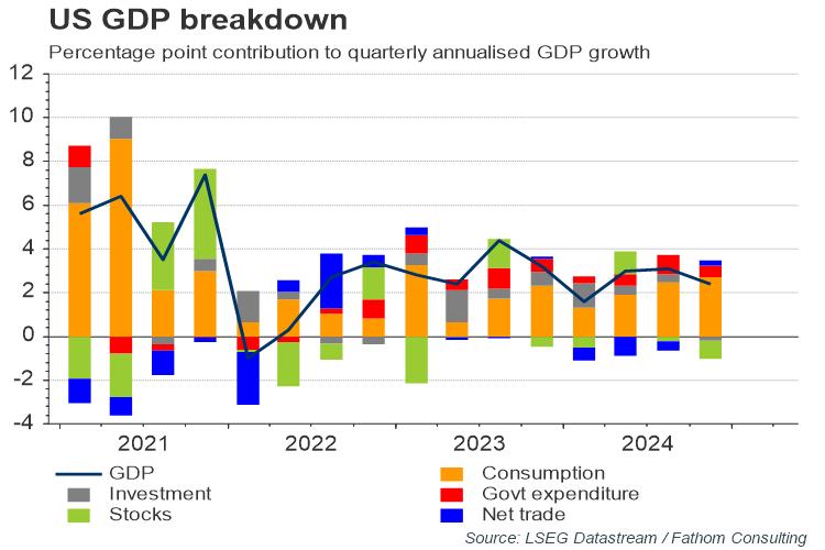 Even the 2024 Q1 GDP report, which showed weaker-than-expected growth of 1.6%, annualised, dampened investors’ expectations of rate cuts: Treasury yields increased in response to the release, as the detail showed that domestic demand remained strong.