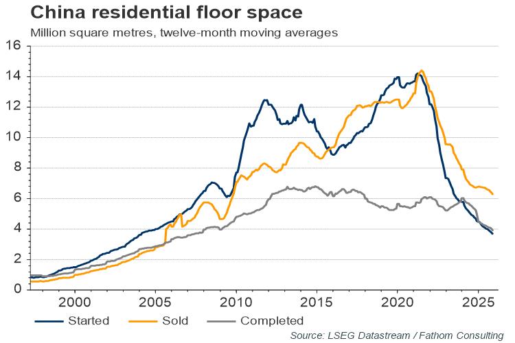 Notably, China is eating into that spare capacity, with the amount of floor space sold (the green line) exceeding the amount started. Nevertheless, there is still a profusion of excess capacity that needs to be carefully juggled alongside: