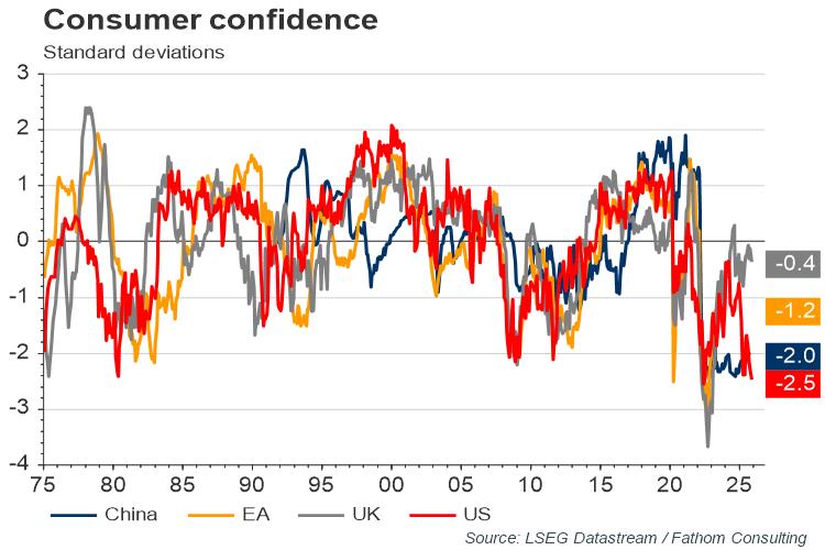 In a recent series of client presentations, Fathom Consulting delivered its latest Global Outlook, Spring 2024. This explored several possible scenarios for the future of the global economy, financial markets and geopolitics. These scenarios were summarised here, in a previous edition of News in Charts. As noted, Fathom’s central scenario argues that the worst is over post-COVID. Consumer confidence looks to echo that more optimistic outlook, as shown in the chart below. Although confidence remains lower than usual, it is on the rise across the US, EA and UK. In short, we conclude that things look to be on the up. But there is an exception to that finding — China, which is the subject of this week’s News in Charts.