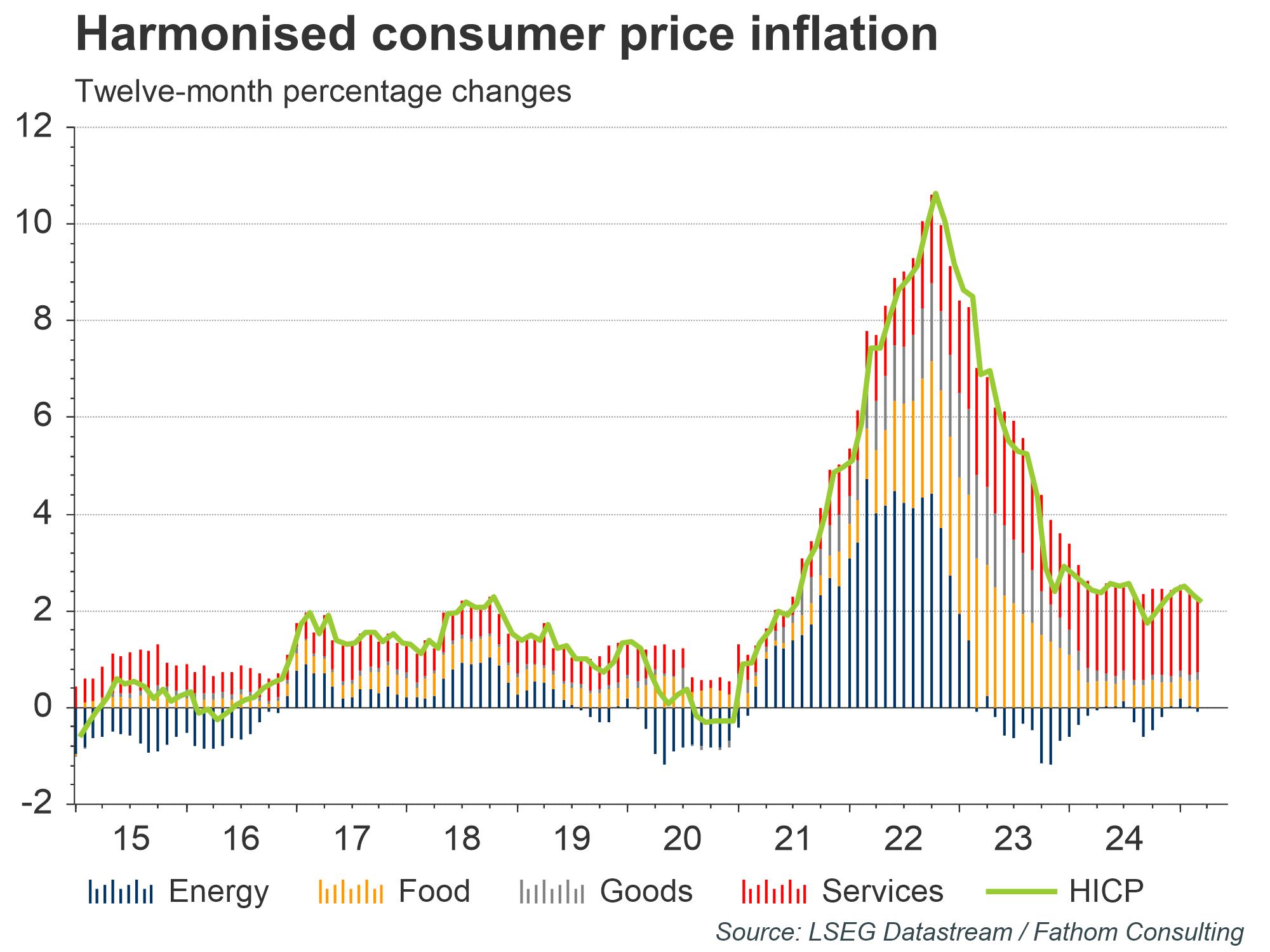 Euro area annual headline inflation was unchanged in April at 2.4 per cent while underlying inflation (headline excluding energy, food, alcohol and tobacco) fell 0.3 percentage points to 2.7 per cent, the lowest recorded figure since January 2022. Compared with March, headline prices rose 0.6 per cent, slightly more than the historical average for this month, driven by higher-than-normal rises in the price of services.