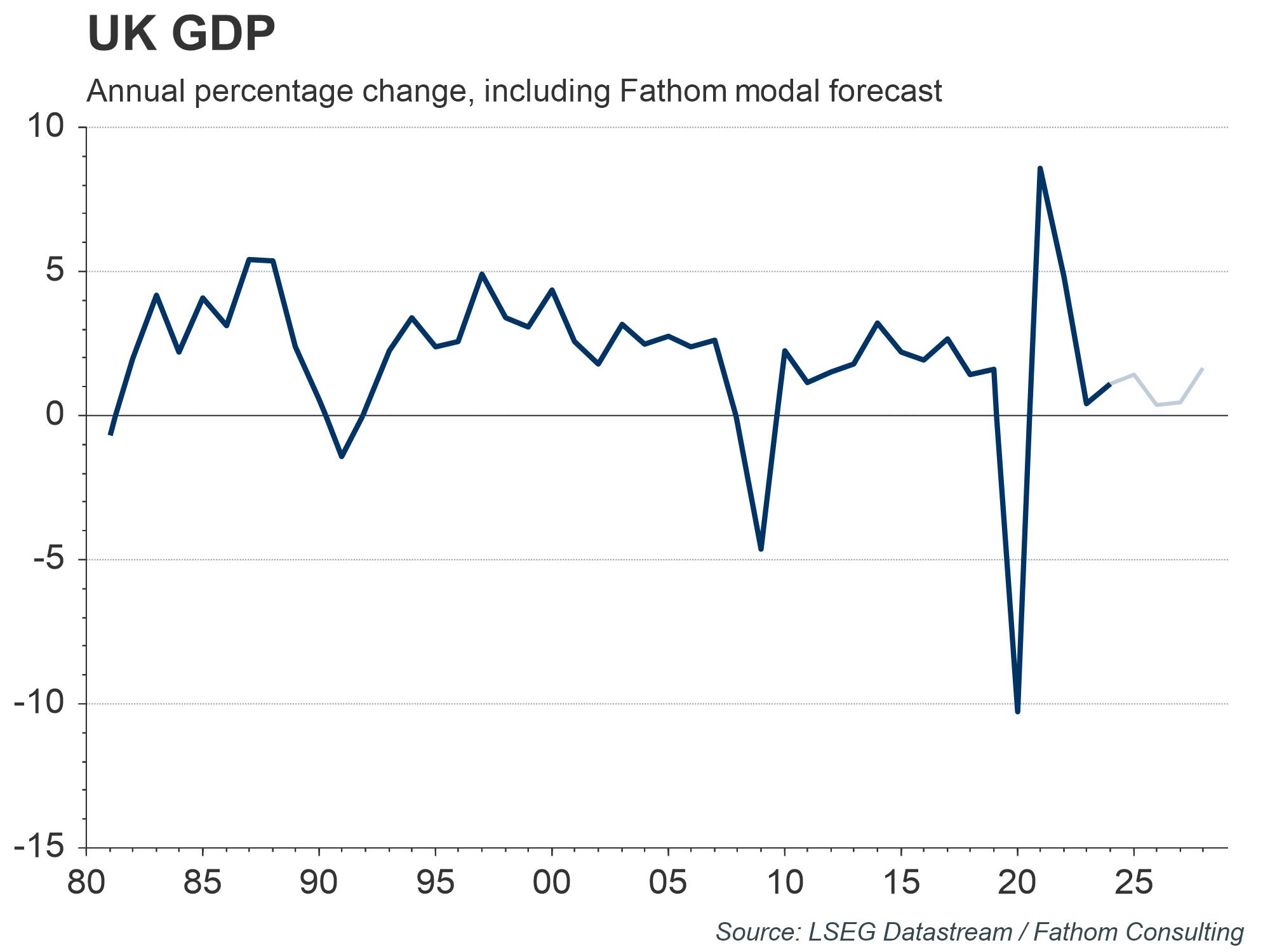 Fathom expects the transatlantic divergence in economic growth to persist over the near term. Indeed, while four-quarter US GDP growth remains close to 3%, the UK economy has essentially flatlined over that same period. With interest rates still elevated, and the potential for additional tail risks (including higher-for-longer rates, global trade wars, and the risk of geopolitical disputes), Fathom’s mean path for UK GDP, shown in the chart below, will make grim reading for incumbent prime minister Rishi Sunak.