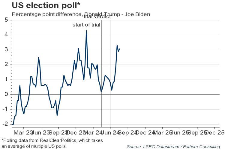 On 30 May, Donald Trump was found guilty of falsifying documents in the so-called ‘hush-money case’, becoming the first former US president to be convicted of a crime. What impact might Mr Trump’s conviction have on his share of the vote? Data from RealClearPolitics, which takes an average from multiple polls across the US, show a slight (0.3 percentage point) drop in Trump’s lead since he was convicted. While the election is far from decided, the fact that Mr Trump continues to lead in the polls suggests that his conviction may not have a significant impact on his share of the vote. Moderate and swing voters are more likely to have been swayed by the verdict than Republican voters – a Reuters/Ipsos poll taken after the conviction found that 10% of registered Republican voters said they were less likely to vote for Mr Trump after the conviction, compared to 25% of independent voters. However, it does not look like the conviction has had a major negative impact on either group, as 35% of Republicans and 18% of independents said the verdict made it more likely that they would vote for him, and 56% of both groups said it would not affect their votes. Although the conviction has not negatively affected Mr Trump in the national polls, if voters in the swing states choose to vote for President Biden or stay at home, this could lead to Mr Trump’s defeat. This is especially true in Wisconsin, Pennsylvania and Michigan, where Mr Trump has the smallest lead, and where polling data from FiveThirtyEight show a very small deterioration of his lead since the conviction. It is plausible that people had already made up their minds about the hush-money case before the conviction, so that the effect on people’s votes was already present before the actual conviction – the news first broke in the Wall Street Journal in 2018.