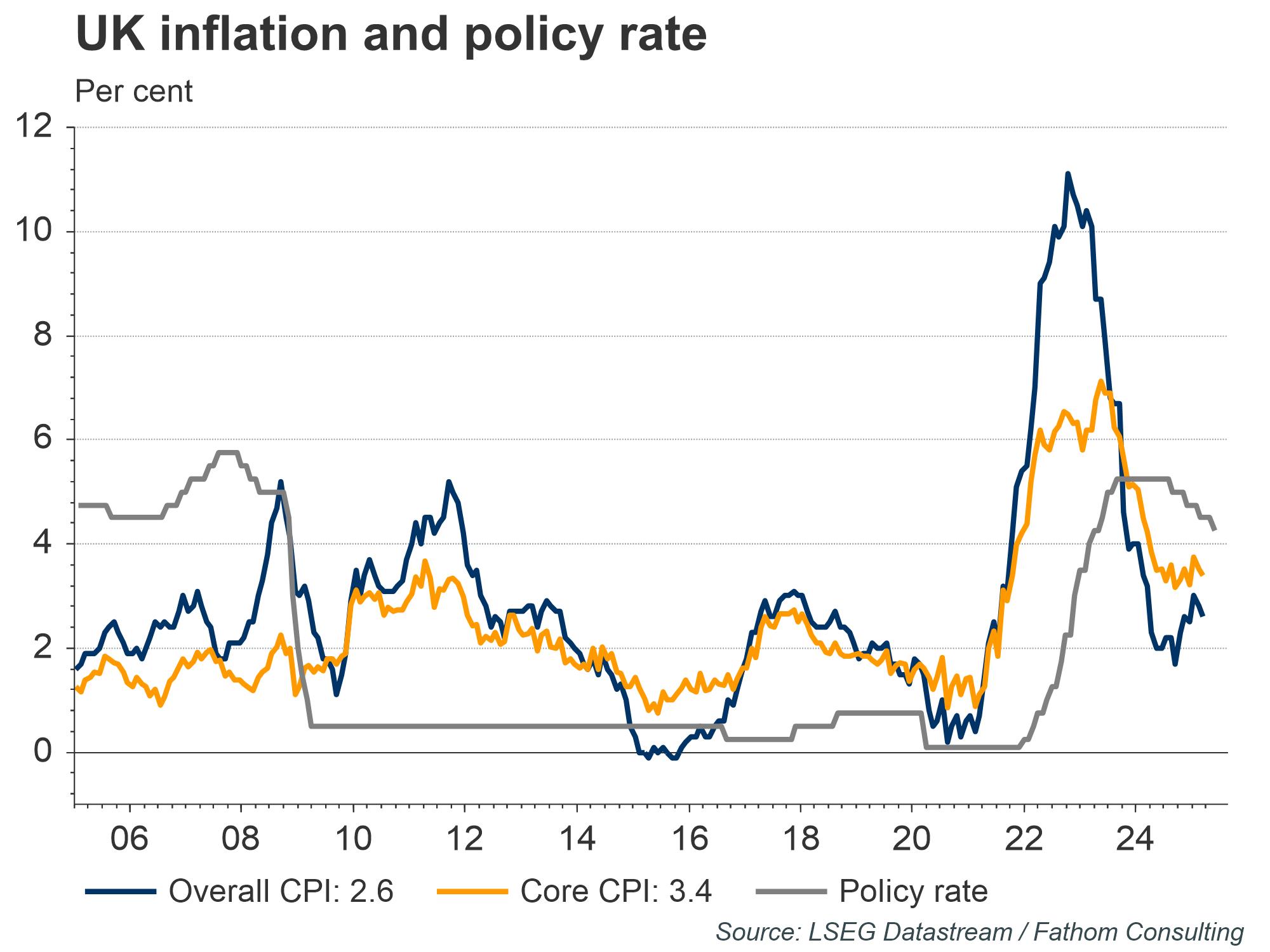 The Bank of England decided to maintain its key policy rate at 5.25% at its June meeting, despite data from the Office for National Statistics (ONS) showing that headline inflation fell to the Bank’s 2% target in May, from 2.3% in the previous month. This marks the first time in almost three years that UK inflation has not exceeded its target. The decline in headline inflation was in line with forecasts by economists polled by Reuters, and means that headline inflation is now lower in the UK than in either the US or the Eurozone. However, core inflation, which excludes food and energy, remains elevated, at 3.5%. Additionally, services inflation was 5.7% in May –  higher than the Reuters poll forecast of 5.5%, which suggests that underlying inflationary pressures persist in the economy. Stickiness in services inflation and ongoing wage pressures were among the reasons that we attached a 60% weight that the UK transitions into a ‘higher for longer’ scenario, in which Bank Rate is on hold until the turn of the year before falling gradually towards a new, higher equilibrium. This scenario was described in Fathom’s Global Outlook, Summer 2024 – charts and analysis from this forecast will be available soon via Chartbook. While higher rates could help boost UK productivity in the long run by shaking out unproductive firms, the Bank of England’s latest decision will be less welcome news to Prime Minister Rishi Sunak as voters prepare to head to the polls on 4 July.