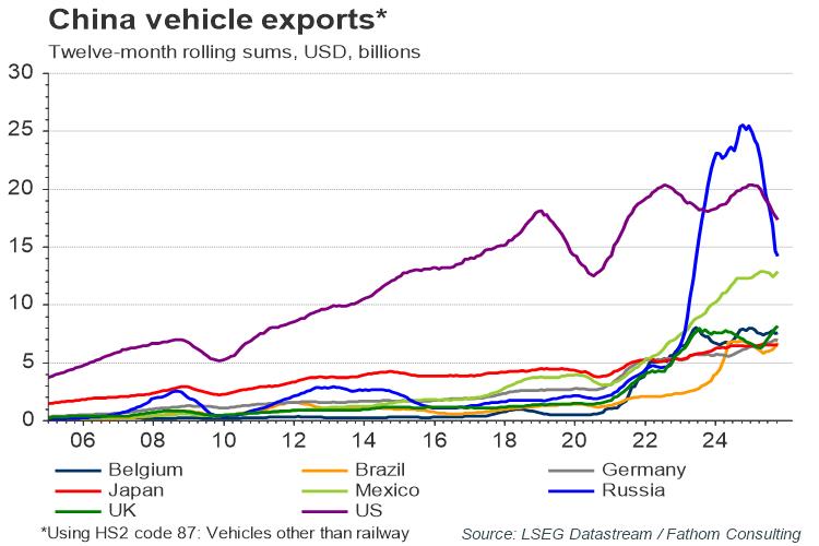 Rising trade tensions with the US are starting to impact China’s vehicle exports to the country, which have declined since mid-2022. Facing tariffs in the US and a potential backlash in Europe, Chinese vehicle manufacturers are increasingly targeting other global markets. Russia became the largest destination for China’s vehicle exports in the year leading up to April 2024, with other significant markets including Mexico, Belgium, the UK and in more recent months Brazil.