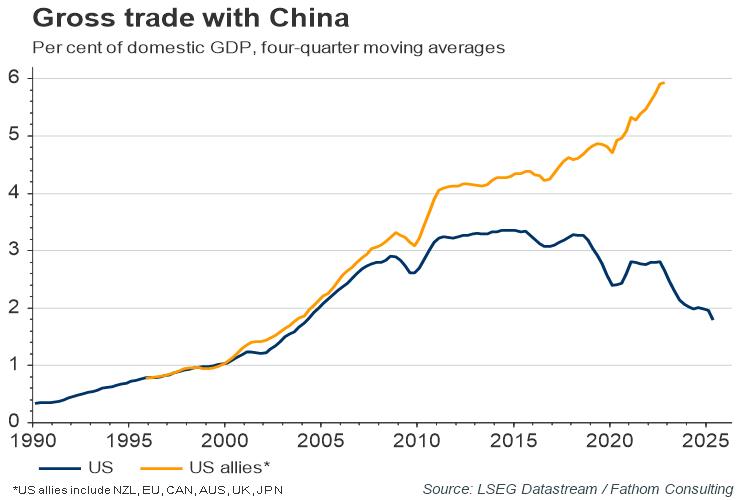 Until now, the US has been relatively isolated in imposing punitive measures on Chinese trade. Its gross trade intensity with China (when measured as a share of GDP) has declined in recent years. In contrast, the equivalent figure in allied countries has increased.