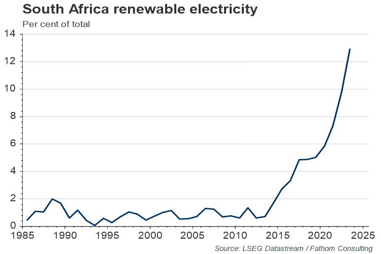 Despite the assistance to Eskom the country has suffered from chronic electricity blackouts which have dented economic activity, sapped business confidence and annoyed residents. And even though the country’s sunny climate is conducive to cheap solar electricity (the country ranks in the top 20% of countries on clean energy potential, according to Fathom’s Energy Transition Scores dataset) just 9% of the country’s electricity came from renewable sources in 2022 – much less than the global average, which is close to 30%. Harnessing this potential and increasing renewable electricity generation further will help South Africa to meet climate targets, alleviate chronic electricity shortages and bolster its economy.