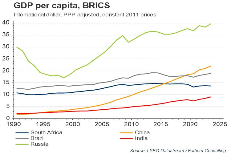 South Africa held elections last month in which the ruling ANC’s grip on power was broken for the first time in 30 years. Voters will be hoping that the new, coalition government – which includes the ANC and its long-time rivals, the Democratic Alliance, plus some other parties – can reverse the country’s long period of economic stagnation. In PPP-adjusted international dollars, South Africa’s GDP per capita is lower now in real terms that it was in 2008; and it has been overtaken by China, while India is catching up.