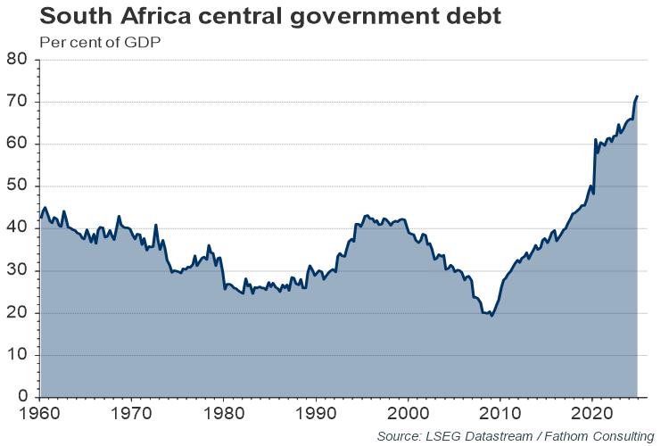 The new administration has little wiggle room for more spending without increasing taxes, though, as the country’s public finances are not in good shape. Although debt is lower than in many advanced economies, the debt to GDP ratio of 67% is considered elevated for an emerging market, and is the highest it has been in at least 60 years. The lack of economic growth means the tax base has not increased as quickly as hoped, while the denominator in this calculation is lower than it ought to be as the country’s economy has stalled. Government assistance to the state-backed electricity provider Eskom has also contributed to the recent deterioration.