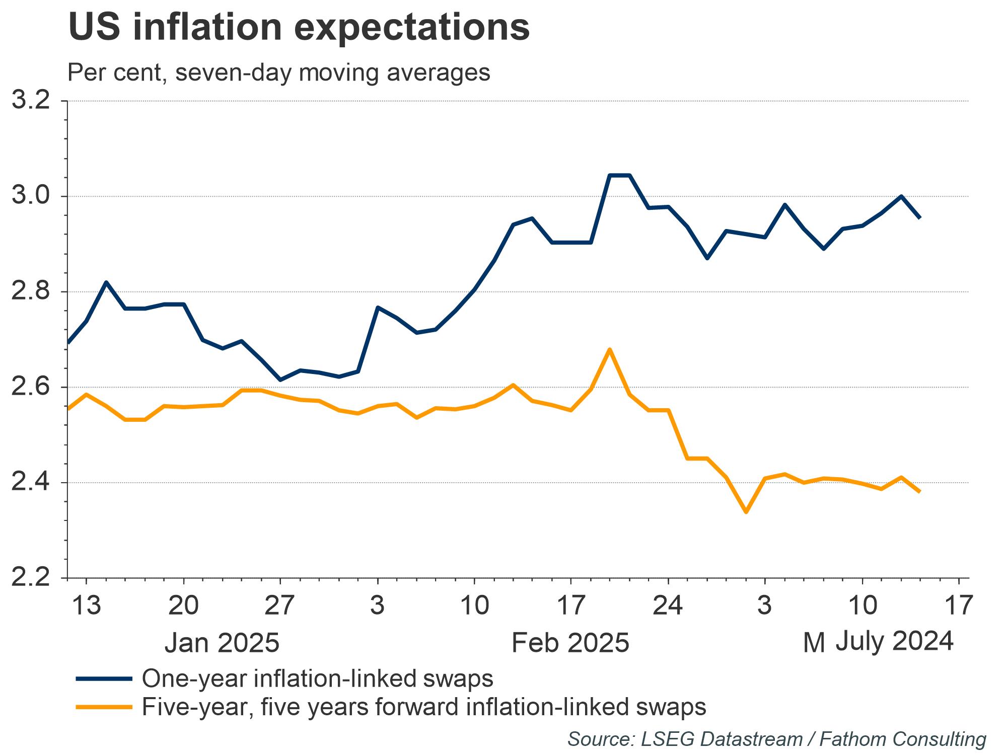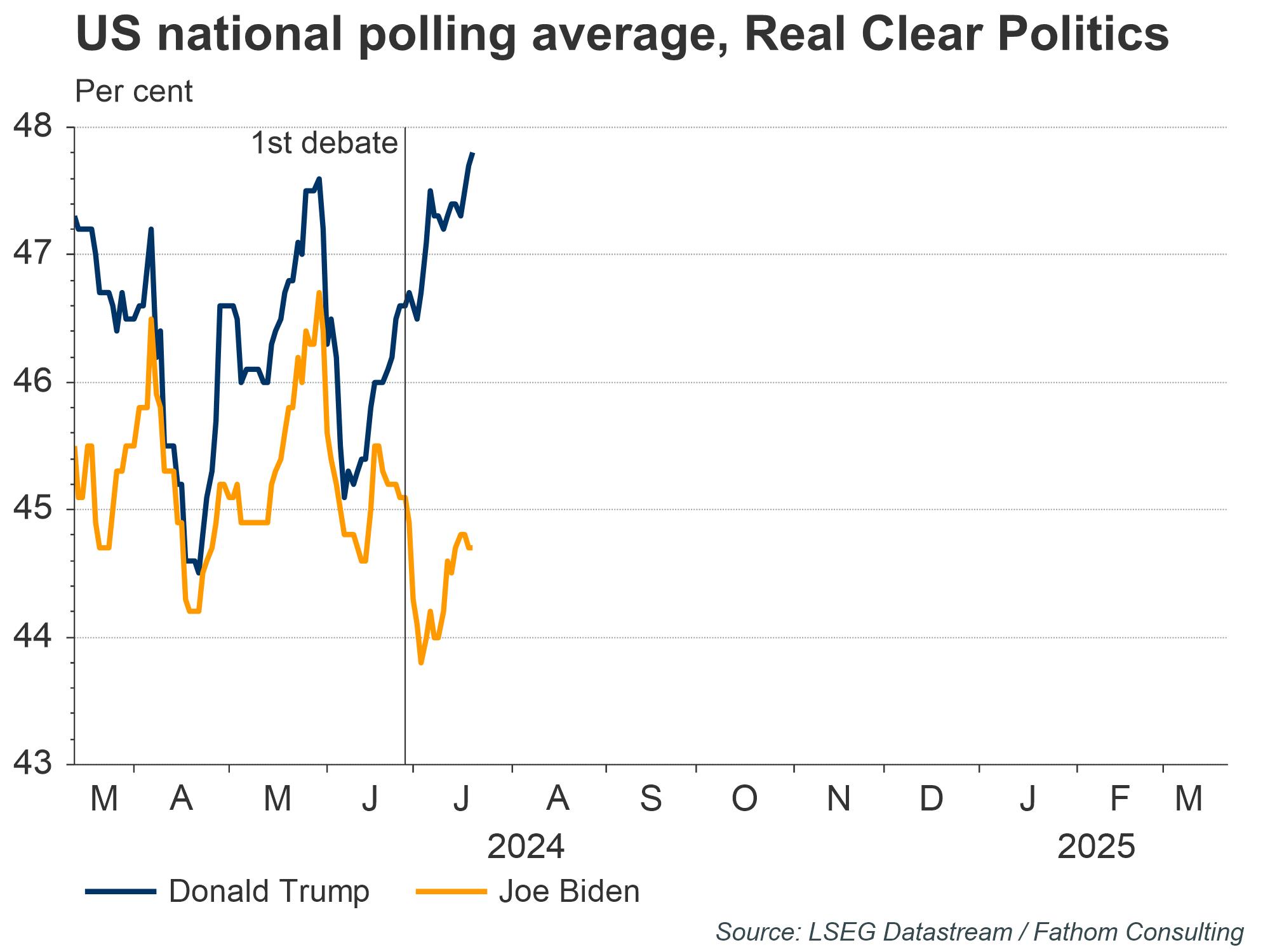 From an economic standpoint, Trump’s first term was associated with fiscal stimulus and deregulation as well as increased protectionism, and that seems like a good initial playbook for a potential second term. Mr Trump is in favour of lower taxes at home, but has mooted a 10% across-the-board tariff on all US imports, with duties as high as 100% on imports from China. That combination would be likely to, all things being equal, increase inflationary pressure. Indeed, one-year inflation-linked swaps increased by almost ten basis points in the immediate aftermath of the debate, before reversing course somewhat.