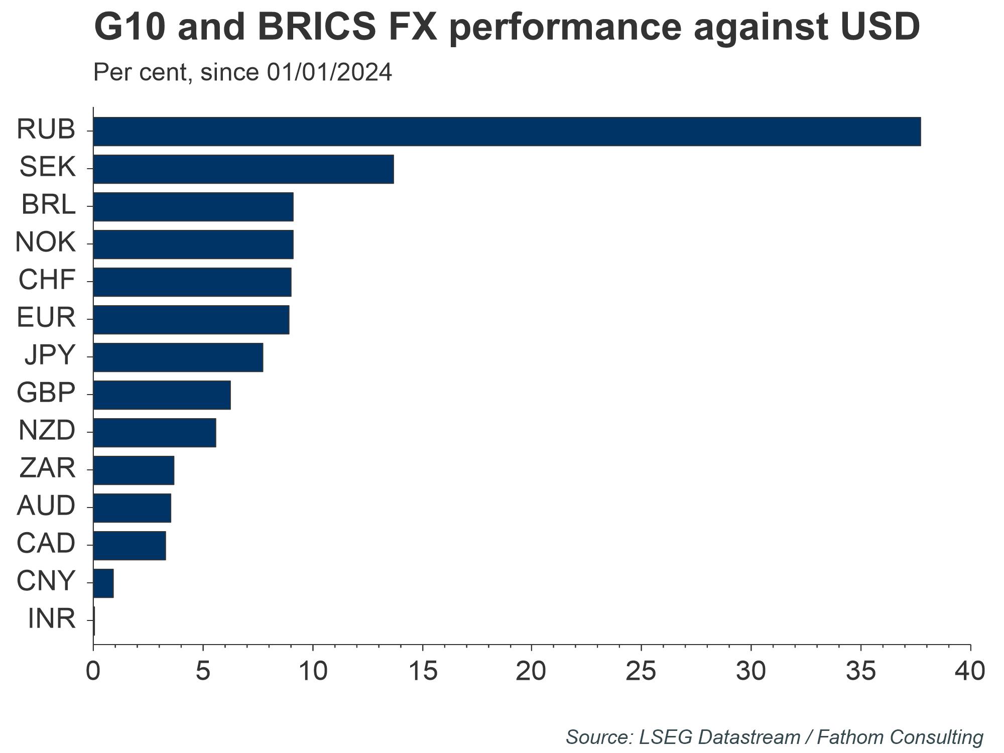 Another aspect for investors to consider is the synchronicity of policy moves across the major economies. The Federal Reserve is often at the forefront of global monetary cycles – tightening before others tighten and easing before others ease, as reflected in the chart below. However, the Bank of Canada, Bank of England and European Central Bank, whose policy rates are most closely correlated with the fed funds rate (out of the G10 currencies and BRICS), have all loosened already this year. Assuming we are on the cusp of a global easing cycle, the Fed appears to be the laggard. This has caught investors by surprise somewhat and helps to explain why the US dollar has appreciated against most major currencies in 2024.