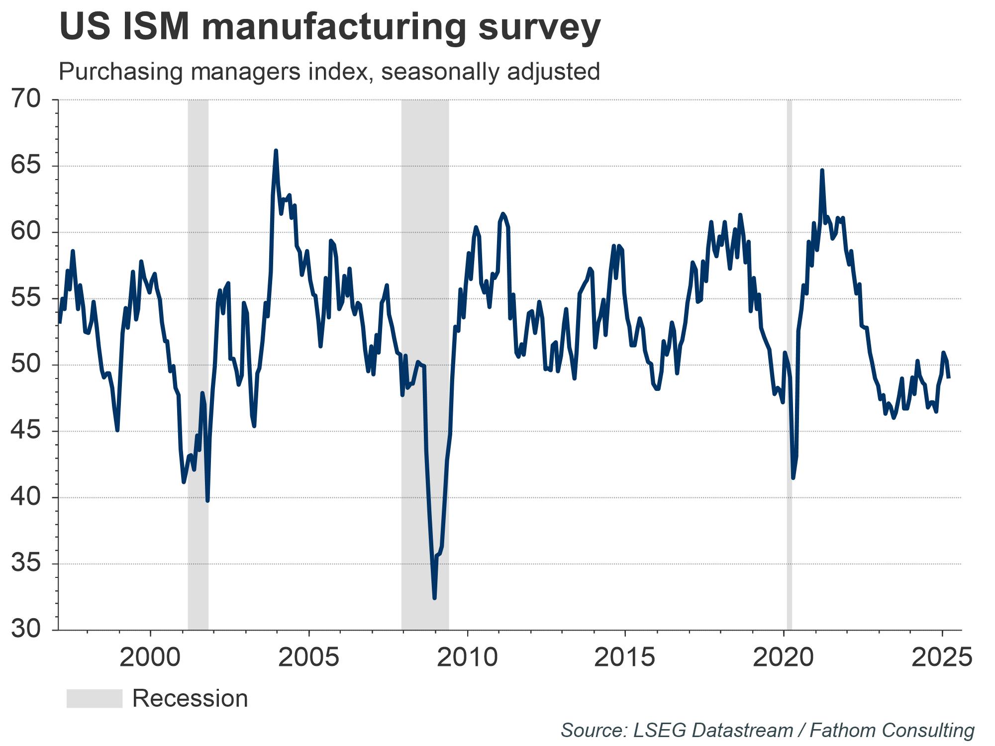 The ‘Sahm rule’ is triggered when the three-month moving average of the unemployment rate increases by half a percentage point or more, relative to its low in the previous 12 months. In the US, this trigger has previously always indicated the start of a recessionary period. Indeed, this trigger has been hit recently in the US, meaning that either the rule will be wrong in the US for the first time or the US is already in recession. Meanwhile, the ISM manufacturing survey points to an economic contraction in the manufacturing sector, with the Manufacturing Purchasing Managers Index (PMI) trending downwards, below 50.