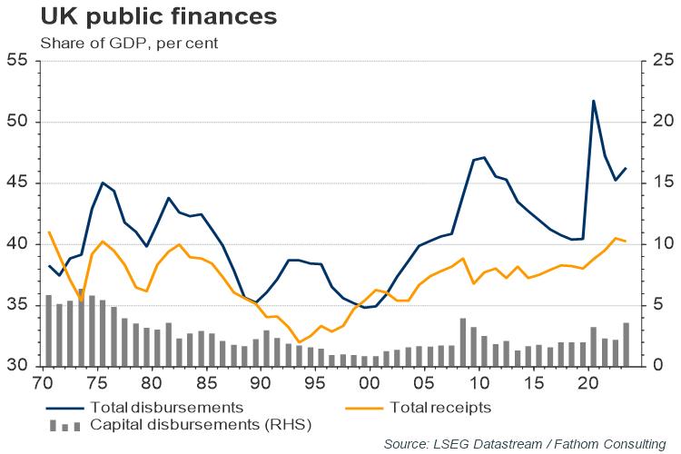 This week’s UK Budget is the first under a Labour administration in more than 14 years, and to describe it as ‘closely watched’ would be something of an understatement. According to standardised OECD estimates, UK government spending (‘disbursements’) exceeded UK government receipts by some 5% of GDP last year. While recognising the fragility of the UK public finances, the Labour government appears keen to borrow to raise capital spending. In our view, this is rightly so. Over the past five to ten years government capital spending as a share of GDP has been running at around half the levels seen during the 1970s, our chart shows. More broadly, in terms of total investment (both public and private) the UK has been at the bottom of the G7 league table for 28 of the past 45 years, which may explain a good deal of the UK’s poor productivity performance, relative to its peers. But the notion of ‘tax and spend’ is politically charged, and economists differ on the likely impact on the economy. In a recent paper, Sebastian Gechert and Ansgar Rennenberg surveyed close to 100 journal articles containing empirical estimates of the ‘fiscal multiplier’ — put simply, the change in GDP that one might expect following an increase in government borrowing, as a multiple of that increase in government borrowing. They concluded that the headline multiplier was statistically significant and close to one. An increase in government spending would, on average, raise economic activity by more than a reduction in taxation; with an increase in government capital spending having a particularly large multiplier, which was statistically significant and greater than one. It is likely that the well-signalled increase in taxes in this week’s budget will grab most of the headlines. But it is worth digging into the detail, and looking at the government’s plans for capital spending, before forming a view on the budget’s long-term economic consequences.