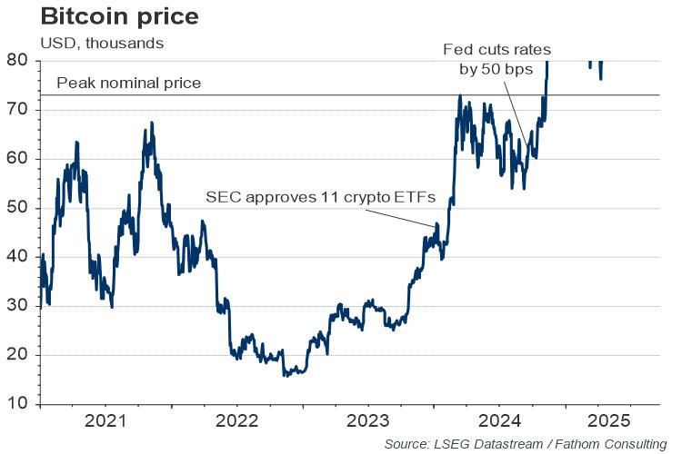 The price of bitcoin reached US$68,420 as of 18 October, up 13.5% since 10 October and 54.8% since the beginning of the year. The surge began after the US Securities and Exchange Commission (SEC) gave approval for eleven bitcoin exchange-traded funds to track the cryptocurrency in January, allowing many new investors to enter the crypto market. Last week the SEC went further by granting ‘accelerated approval’ for the funds to list and trade options tied to spot bitcoin prices on the NYSE. The 50-basis-point cut in US interest rates last month has also played its part in bolstering the attractiveness of assets with no associated cashflow, such as cryptocurrencies. Meanwhile, there has been a change in tone by the US presidential candidates on cryptocurrencies, with Donald Trump – who previously called bitcoin a ‘scam’ — now openly supporting bitcoin-mining in the US, promising to reduce cryptocurrency regulations and even suggesting creating a BTC reserve to pay off national debt. By contrast Kamala Harris has generally aligned with the Biden administration’s cautious attitude towards cryptocurrencies, but after the SEC’s move in January, the Democrat candidate has made efforts to build relationships with big players in the US crypto industry. The US election on November 5 may therefore decide whether bitcoin’s price will continue to grow. While it is possible to identify short-term factors that affect the price of BTC, on a longer-term view, and in a strict sense, BTC remains fundamentally worthless, in common with other cryptocurrencies. Nevertheless, many people have assigned great value to those assets, and for a sustained period of time. As we set out in 2021 in ‘A tale of two cryptos’[1], even on a more generous view, BTC appeared significantly overvalued then, and continues to do so now.