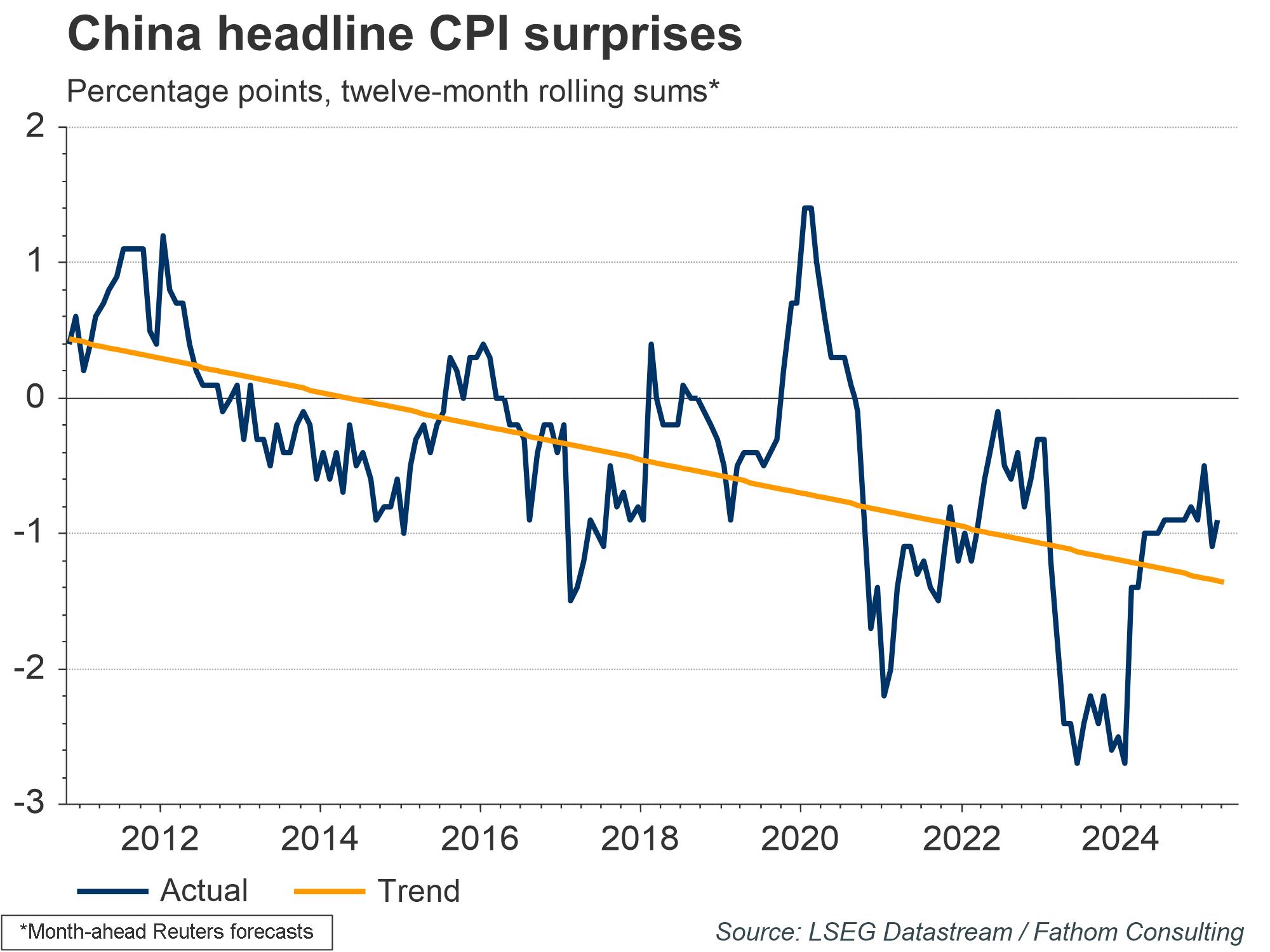 Consumer prices in China increased by just 0.4% in the year to September, the National Bureau of Statistics said on 13 October. The outturn was 0.2 percentage points below the expectations of the consensus of economists polled by Reuters. Chinese inflation outturns coming in below consensus should not be entirely unexpected — as the chart below shows, this has tended to be the case for several years. An additional worry for policymakers in the PRC is that core inflation dropped to just 0.1% in the year to September, reflecting continued weak demand in the Chinese economy. Moreover, we do not expect this picture to change materially in the near-term — the fiscal stimulus measures announced recently have disappointed investors. Our expectation is that China’s economy expanded by just 1.2% quarter-on-quarter in Q3, far below its typical rate of growth in recent years.