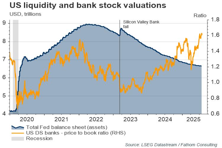 Another vote of confidence in the resilience of US equity valuations is the fact that the book-to-market ratios of US banks are going from strength to strength, seemingly having weathered one of the fastest monetary hiking cycles in history and despite ongoing quantitative tightening (QT) pressures from the Fed. As Fathom described in an earlier blog in March 2024, banks act like a canary in a coal mine, picking up problems in the economy and markets before they spread more broadly. The current health of the banking sector is good news in this respect.