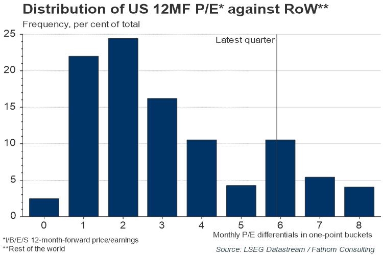 Looking ahead, the outperformance of US equity is set to continue, according to the forecasts of the Institutional Brokers’ Estimate System (I/B/E/S). Its 12-month-ahead price-to-earnings — the main earnings multiple, and a key valuation metric — for US equity is six times the size of the rest of the world’s (RoW). To put that into context, this latest US–RoW difference sits on the upper end of the distribution and only two more positive US–RoW differentials have been observed. But forecasts entail a degree of uncertainty, and the current, favourable valuations may prove too high and subsequently be corrected if the economic outlook was to take a turn for the worse.