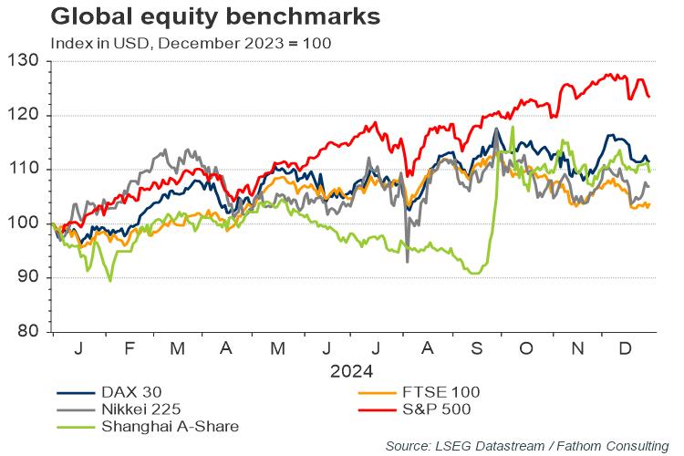 With almost a month left in 2024 it seems appropriate to take stock of what the markets have done this year. It is looking likely that the undisputed winner will yet again be the US equity market. Gaining around 26% with only 6.5% drawdown, and with 57% of days so far recording positive returns, the 2024 S&P 500 seems to be on a relentless upward path compared to other global equity benchmarks. But that wasn’t always the case in 2024. During the first quarter of the year Japan’s Nikkei 225 made gains over the S&P 500, due to a falling yen that made exports cheaper and also due to significant changes to monetary policy, with a rare rate hike in March 2024 and less restrictive yield-curve control that made the Japanese market more attractive to investors. Germany’s DAX 30 also challenged the S&P 500 on the back of a strong outlook for fundamentals, which was however due to index constituents’ sensitivity to — in that case, positive — shifts to global demand and not to slowing domestic demand.