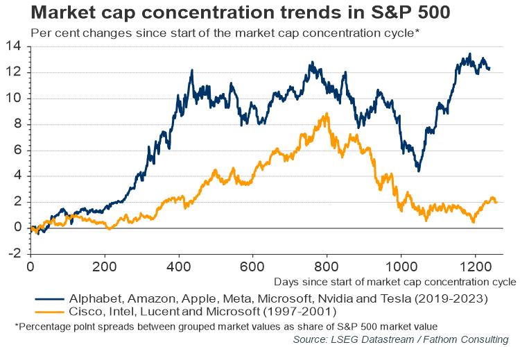The recent US outperformance owes a lot to the high valuations earned by technology stocks, and in particular by a small group nicknamed the ‘Magnificent Seven’ which includes the likes of Nvidia, Apple and Alphabet. Notably, a similar group existed during 1997–2001, and the pattern of its collective market share tracked the boom and the burst of the dot-com bubble. The Magnificent Seven presents a pattern highly correlated to the 1997-2001 timeline — but the burst in market shares just before the 1000th day was nowhere as dramatic as in 1997–2001. That was probably due to the Seven’s very strong fundamentals, and the demand for their products that finds no match in the equivalent 2001 group. What is more, the Magnificent Seven not only broke but reversed the correlation with the old group, as their valuations rotated to an even higher market share after the 1000-day sell-off.