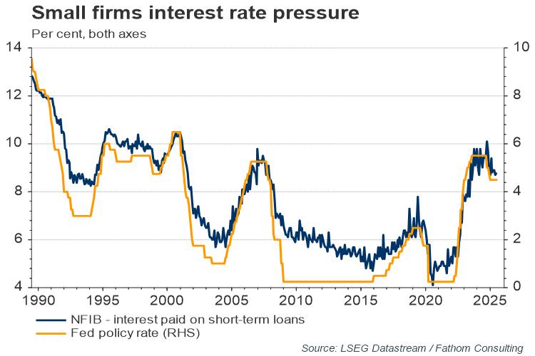 Although the economy is holding well, small firms are feeling the squeeze from the interest rates on short-term loans, which remain at 15-year highs even after the Fed cut a cumulative 0.75 points since it started lowering rates in September 2024.