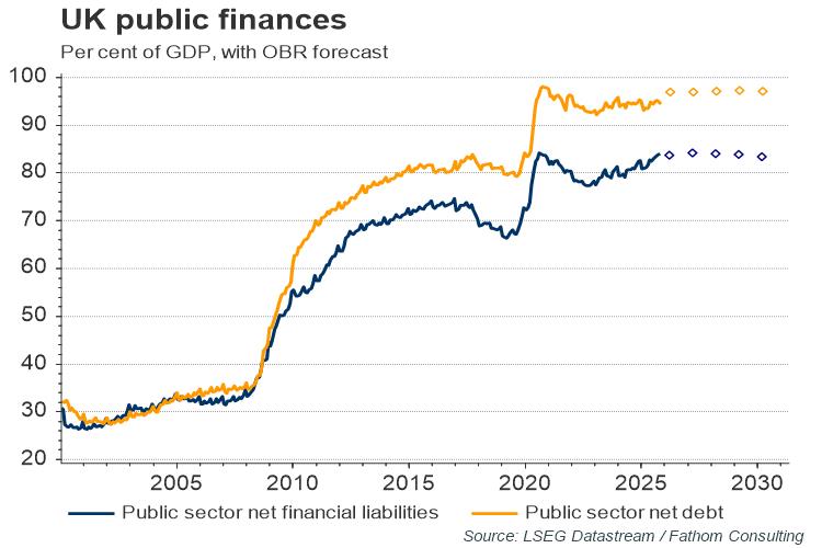 With the direct effect of higher taxes estimated to raise an additional £42 billion in revenue, the shortfall, which is estimated to be £36 billion once the indirect effects of the new measures are taken into account, will be covered by higher borrowing. As Fathom has suggested previously that she should, the Chancellor has changed the fiscal rules to give more leeway for borrowing to fund investment, by targeting public net financial liabilities rather than public sector net debt. Meanwhile balancing the current rather than the capital budget also buys additional room for investment.