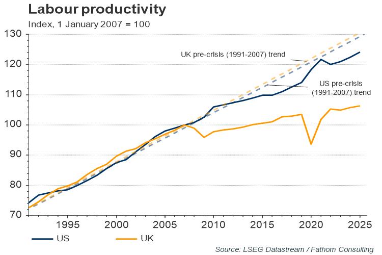 The global financial crisis of 2008 brought with it a structural shock to labour productivity across the world, but since the crisis, US and UK labour productivity have trended very differently. US labour productivity started to return to its pre-crisis (1991–2007) trend, whereas UK labour productivity growth has flat-lined and diverged strongly from its pre-crisis trend. There are many reasons for this, including the competitiveness of their respective domestic industries, the size of the market that these industries have access to, and electricity price differential; but one reason is certainly the more cautious approach to investment taken by the UK’s public and private sector. This has manifested itself in low levels of R&D expenditure and innovation in the economy, both of which are key drivers of long-term productivity growth. The Labour party’s budget seems to have begun to address this, with a record amount of R&D investment, around £20.4 billion or approximately 1 percent of GDP, being penned in for 2025-26. This compares to around £12.8 billion, or 0.6 percent of GDP dedicated to public R&D in 2021. Sectors with high potential for innovation — AI, net-zero technology, aerospace and life sciences — have been specifically earmarked for R&D investment. These commitments are a step in the right direction, but by themselves are unlikely to reverse the trend in productivity growth that has developed in the UK over the last decade and a half.