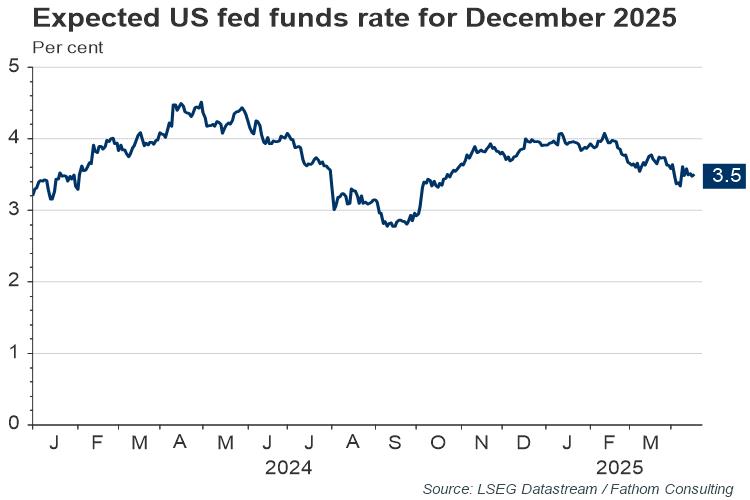 December’s meeting of the FOMC proved somewhat more hawkish than investors expected, and market pricing now sees the federal funds interest rate at 4% by the end of 2025. This follows something of a roller coaster year, with expectations peaking at over 4% in April before dropping below 3% in August, when increasing signs of labour market weakness were the primary concern. Now, with sticky inflation and continued job market gains, committee members have moved their focus to the inflation side of their dual mandate. In the meeting that finished on December 18, the median voter upgraded their view (relative to September) of core PCE inflation by 0.2 percentage points in 2024, 0.3 percentage points in 2025 and 0.2 percentage points in 2026. Despite this persistent inflation overshoot compared with their target of around 2%, members see rates being cut to 3.4% by 2026. We at Fathom see upside risks to that forecast, penciling in a fed funds rate of 4.25% by end-2026. Labour market outturns, and the precise policy mix that the incoming Trump administration implements, will both be critical to developments that could change that.