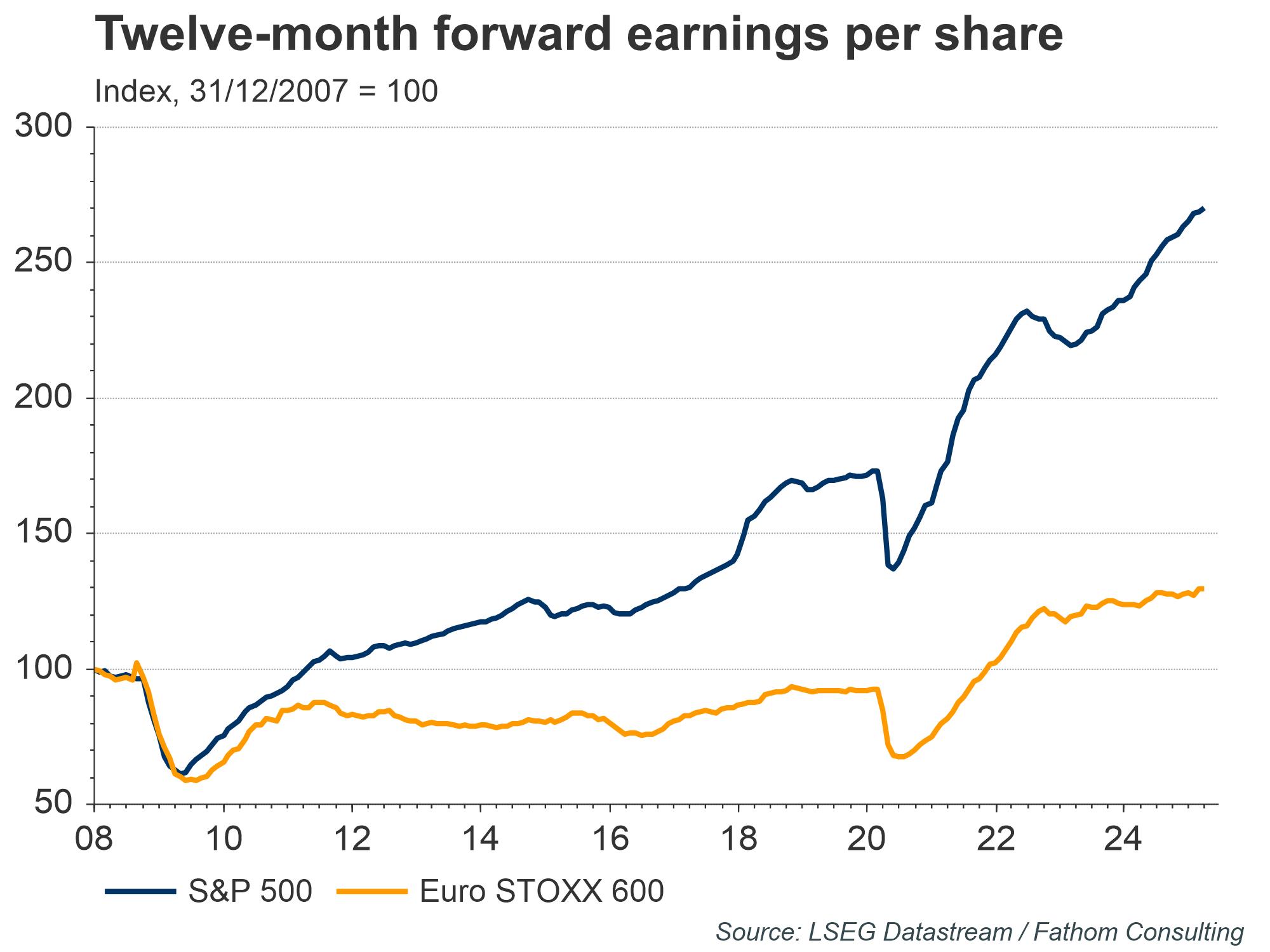 This point comes through strongly from a comparison of the earnings of European and US stocks. Since 2022, 12-month forward earnings for US large-cap companies have been on a steady upward trajectory as their European counterparts broadly flatlined. This further divergence in fundamentals is what is supporting loftier US valuations and returns and further highlights the deeply intertwined relationship between economic and financial market trends. We discuss the corporate euro area and more in Fathom’s Global Outlook, Winter 2024. We discuss the corporate eEuro area and more in ourFathom’s Global OutlookGlobal Outlook, Winter 2024. Further analysis and charts from this forecast will be available soon via Chartbook.