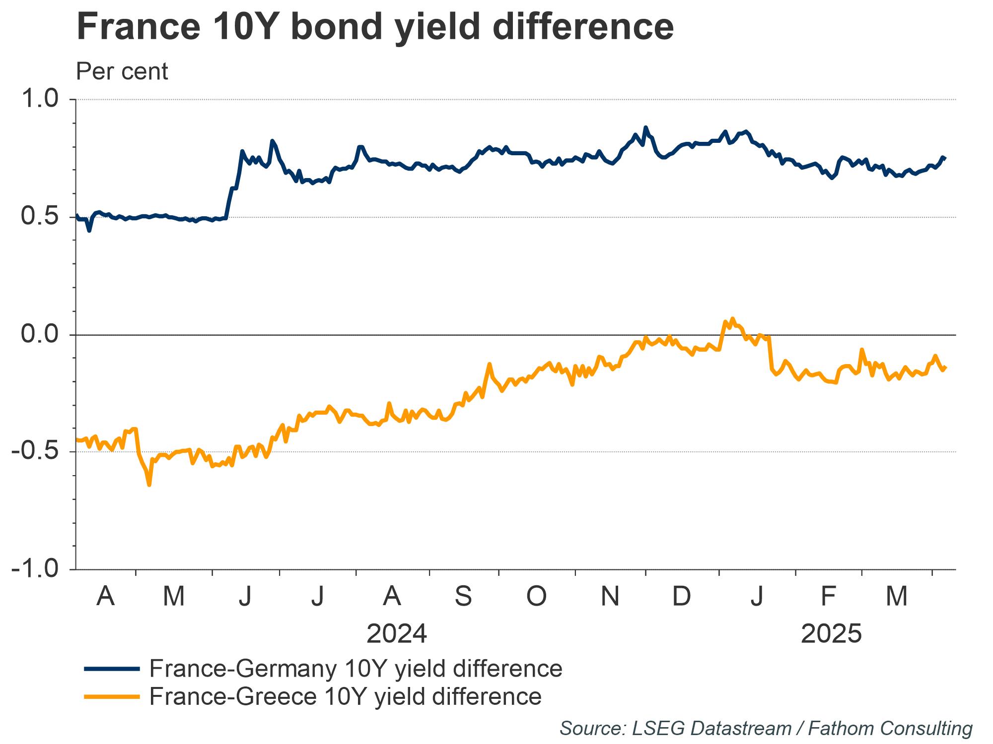 On Thursday 5 December, Michel Barnier resigned as French Prime Minister following an overwhelming no-confidence vote against him which was supported by 331 MPs. The vote was submitted on Monday by the far-right National Rally party after Mr Barnier attempted to use Article 49.3 of the French Constitution to force a budget through parliament without a vote. The budget, which fell through, had included tax hikes and spending cuts to the order of 60 billion euros (US$63 billion) in an attempt to get a grip on France’s debt. Mr Barnier warned that voting him out would not solve the country’s financial issues. With bond investors fearful of France abandoning efforts to cut borrowing in the event of a government collapse, French borrowing costs overtook those of Greece for the first time ever on 28 November. On 2 December, the 10Y bond yield difference between France and Germany peaked at 88bp — the highest the gap has been since the 2012 Eurozone crisis.