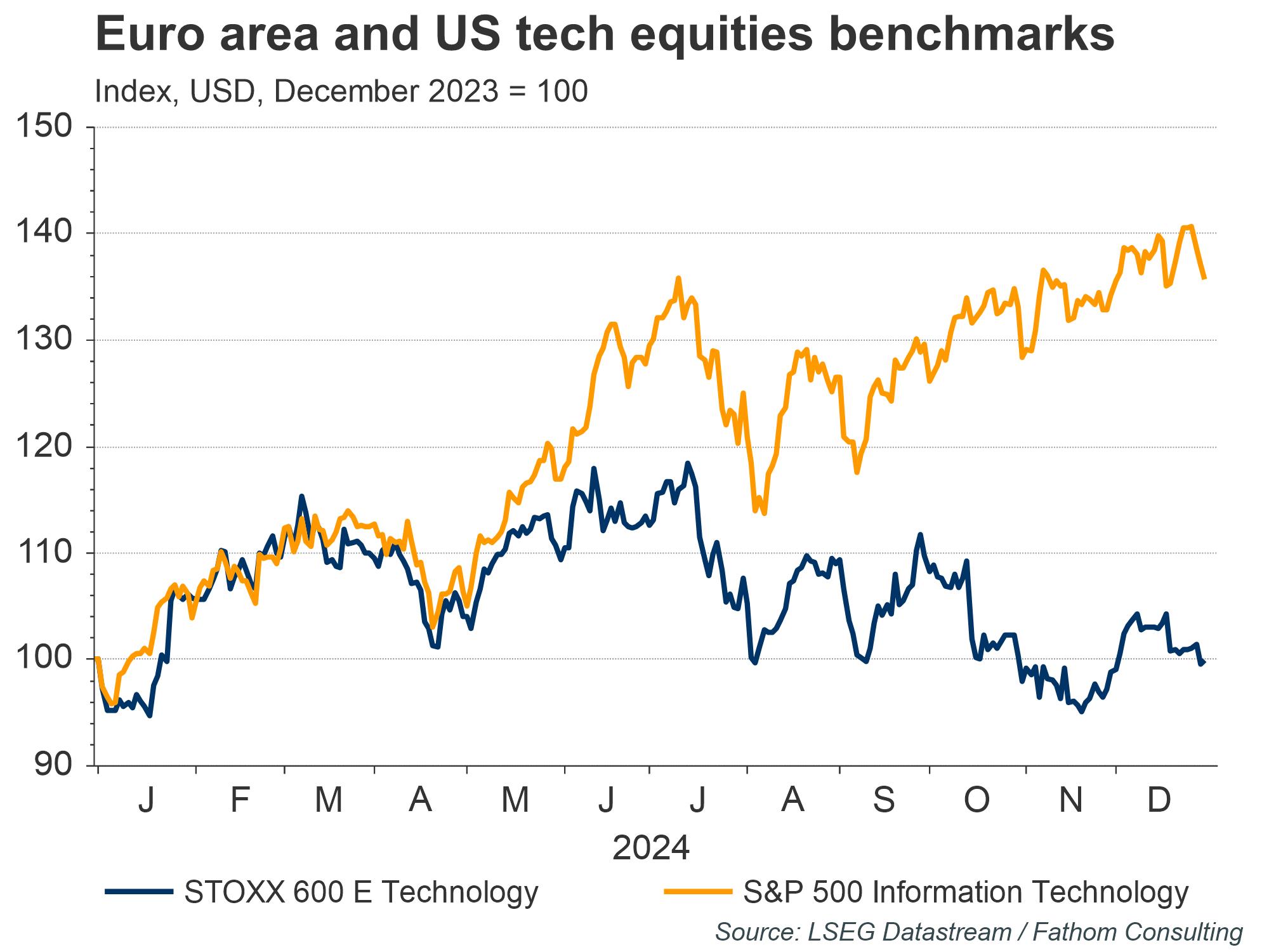 Fathom also notes the contrast between the US and the euro area over investment, especially the euro area’s increasingly sluggish expenditure on research and development (R&D). The innovation gap between the US and the EU has widened — something that was flagged by former ECB president Mario Draghi in his recent policy recommendations to boost the competitiveness of the euro area. Mr Draghi called for €750-800 billion per year of co-ordinated public and private investments to fund euro-wide investment increases. The report aimed at sparking a debate around what type of government spending should be prioritised to support growth, and ultimately make the fiscal policy constraints in the euro region less binding. Unfortunately, no concrete plans have emerged to move forward on these suggestions. Fathom believes that this inertia will be a significant limiting factor for the euro area’s growth prospects relative to the US.