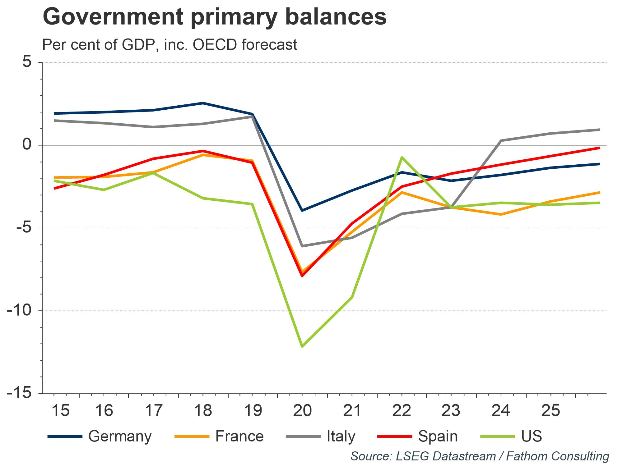 In Fathom’s Global Outlook, Winter 2024 we argue that the increasing differences in fiscal policy have already led to growth and interest rate divergence between the US and Europe, and that this is set to continue. The effects of these differing fiscal policies on demand are one key reason why inflation expectations and rates are normalising faster in the euro area.