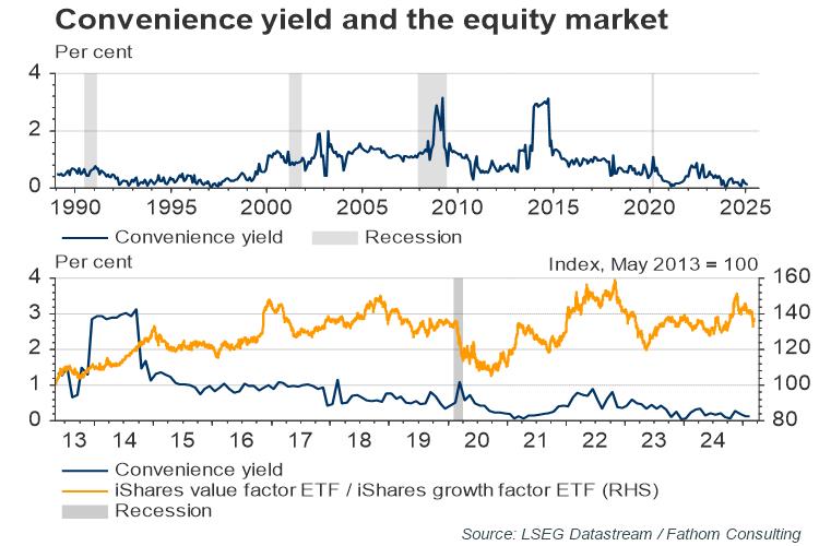 U.S. Treasury bonds are considered safe, convenient, and easy to trade, making them the preferred choice over other low-risk investments. Their yield is relatively low but this ‘convenience yield’ reflects the implicit premium that investors are willing to pay to hold Treasuries, compared to less liquid assets like AAA corporate bonds. This yield typically peaks during recessions or indeed before (such as before the 2001 dot-com crash). In recent years, the rotations of the convenience yield and of the equity market have continued to respond to the same underlying economics The key driver behind this is whether investors expect earnings and revenue growth to be broad-based or concentrated in safe assets. When growth is anticipated to be scarce and concentrated among safe assets, investors flock to U.S. Treasuries while, for the same reasons, value stocks lose ground to growth stocks. Conversely, when growth is expected to be strong and widespread, investors move away from Treasuries, favouring value stocks as they promise better risk-adjusted returns than growth stocks. A notable shift occurred in November 2024, with value stocks outperforming growth. However, by December amid revived inflation expectations and reduced rate-cut forecasts, value stocks lost these gains and demand for US Treasuries jerked up. The latest rotation back to value stocks suggests a reinvigorated anticipation of a better outlook for more corporates — which potentially tags along with lower demand for the ‘convenience’ of U.S. Treasuries.