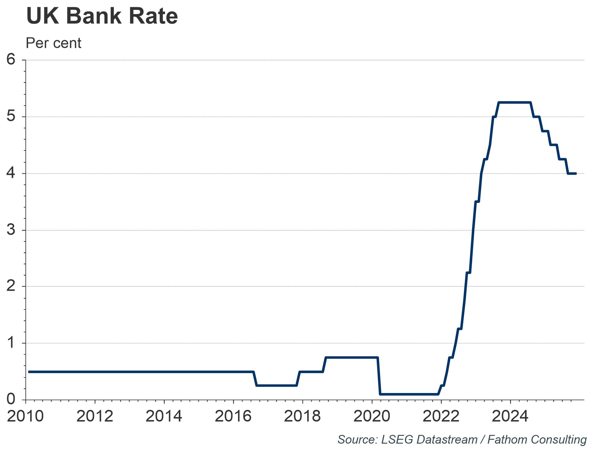 Stagnating economic growth has been a recurrent issue for the UK in recent years. However, growth has fared particularly poorly in the past few months. GDP figures for September and October 2024 point to two consecutive months of contraction for the first time since the pandemic. Coupled with this, UK consumers and businesses seemed to have zeroed in and been spooked by the tax increases announced in an otherwise expansionary budget. As a result, one can expect growth figures for 2024 Q4 and 2025 Q1 to continue to disappoint, with Fathom expecting downside risks to the consensus forecast of 0.4% growth in 2025 Q1. This has created some pressure on the BoE to cut rates, in order to provide support to a slowing economy.