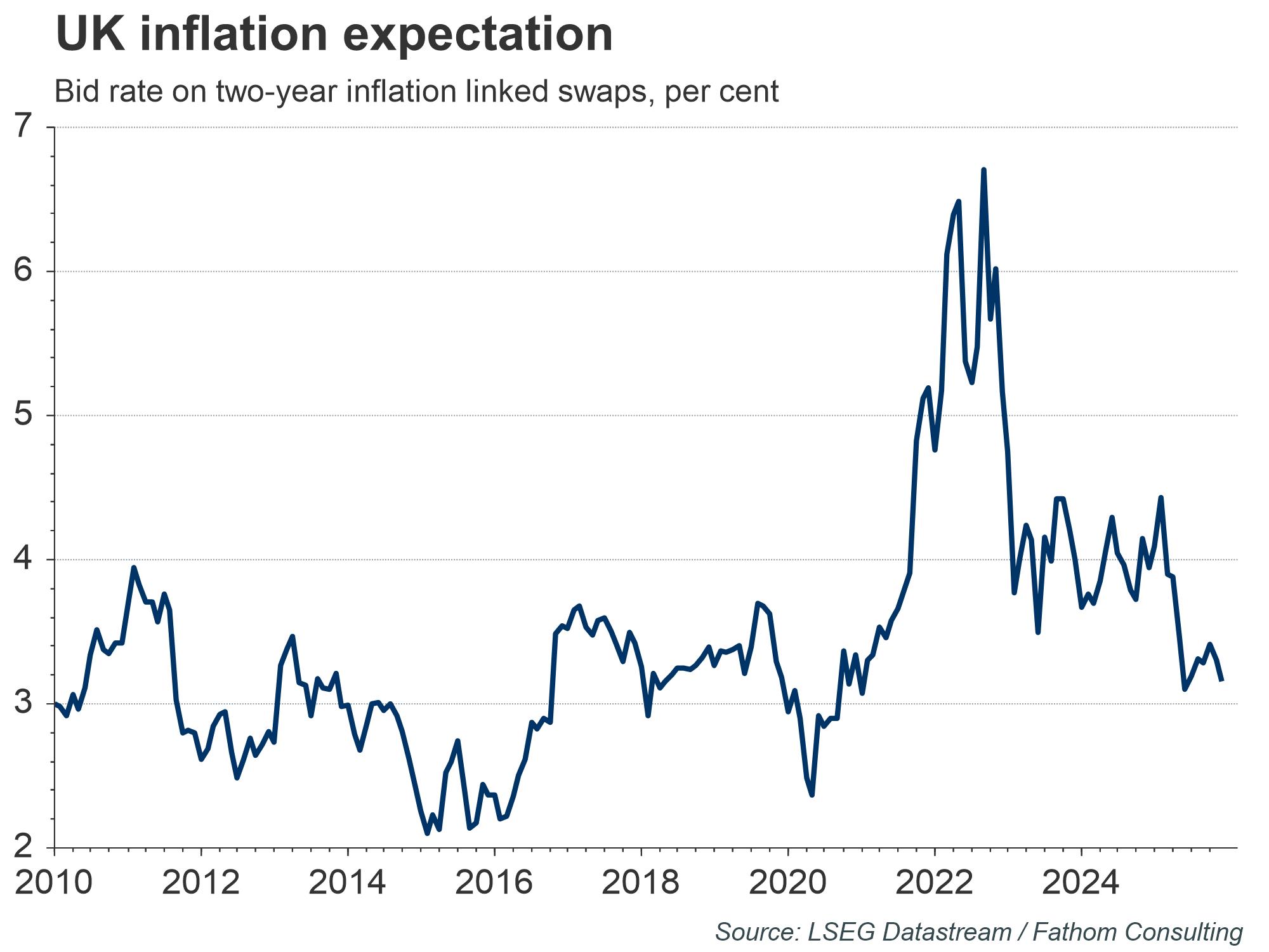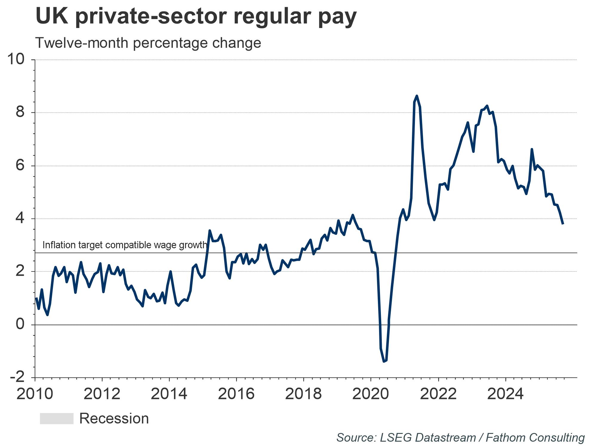 The post-pandemic spike in inflation has materially changed inflation expectations in the UK, which has manifested itself as elevated levels of private-sector regular wage growth. The higher levels of private-sector regular wage growth are both a cause and an effect of higher core-inflation figures, resulting in a vicious feedback loop that prevents core-inflation from sustainably declining towards target. To be in a position where the UK can sustainably hit the inflation target, the rate of wage growth should be equal to the value of target inflation plus productivity growth, which was in the range of 0–0.75% pre-pandemic. That would take the ideal level of wage growth closer to 2–2.7%, much lower than where it sits currently.