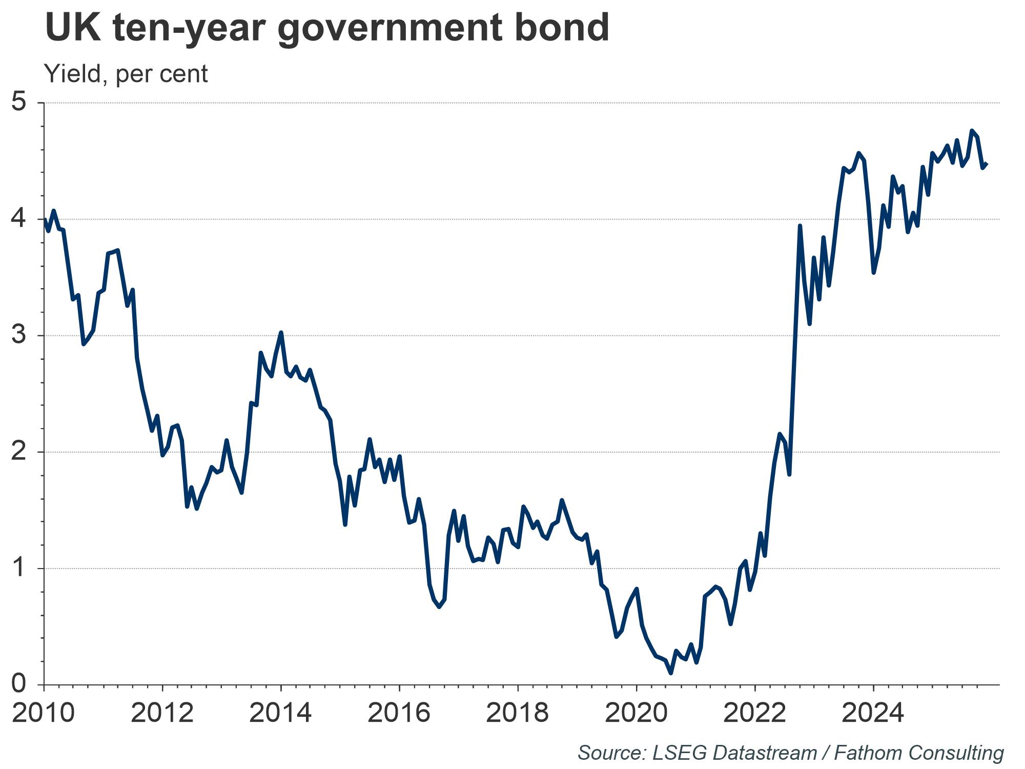 More evidence pointing to the systematic change towards higher inflation expectations comes from the market pricing of Retail Price Index (RPI) linked two-year inflation swaps, which have averaged 4.6% since 2022, compared to 3% in the 2010 to 2020 decade. The steady increase in ten-year government bond yields can be explained partly by market expectations of higher inflation and the future path of interest rates as a response to it.