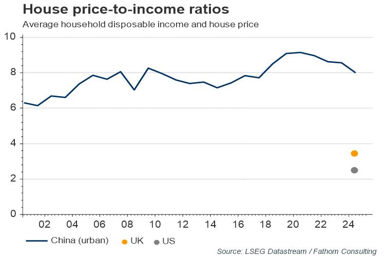 Lower house prices have made Chinese housing marginally more affordable in 2024, as shown in Fathom’s newly updated China housing market indicators, but prices would have to drop far more drastically for China’s total housing stock to clear. With a full-scale housing collapse an unenviable prospect, Chinese authorities are attempting to drip-feed the excess supply into the market, by amongst other things extending construction times, which are currently at around nine years.